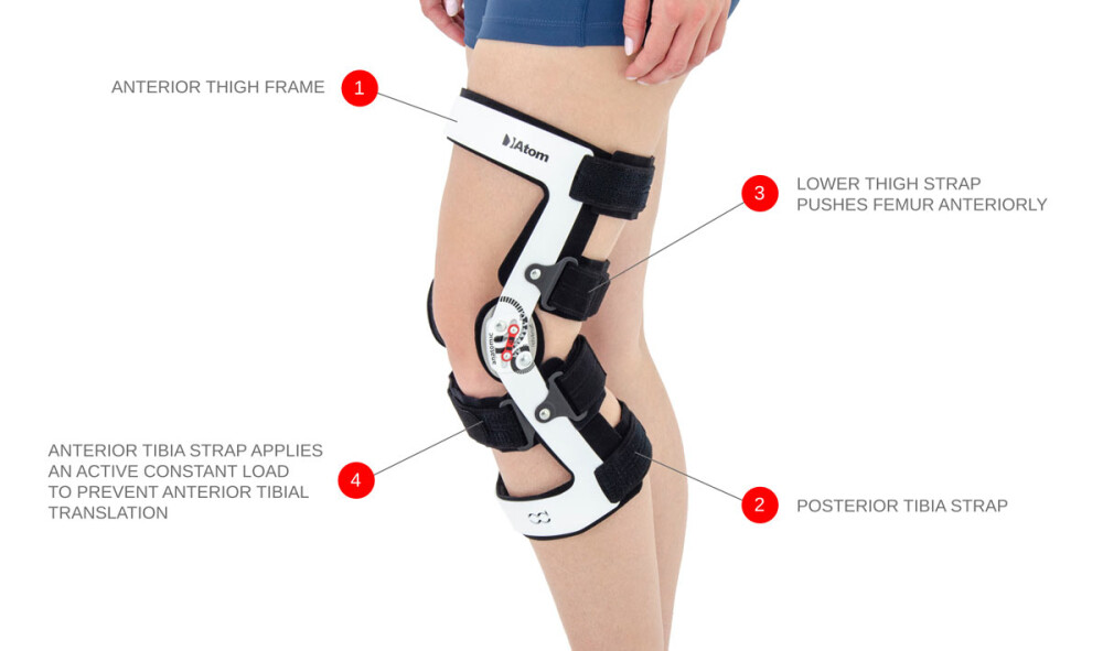Četrta točka je trak na sprednji strani meča, ki ustvarja prednapetost na golenico s potiskom nazaj – s tem se zmanjša napetost v ACL.