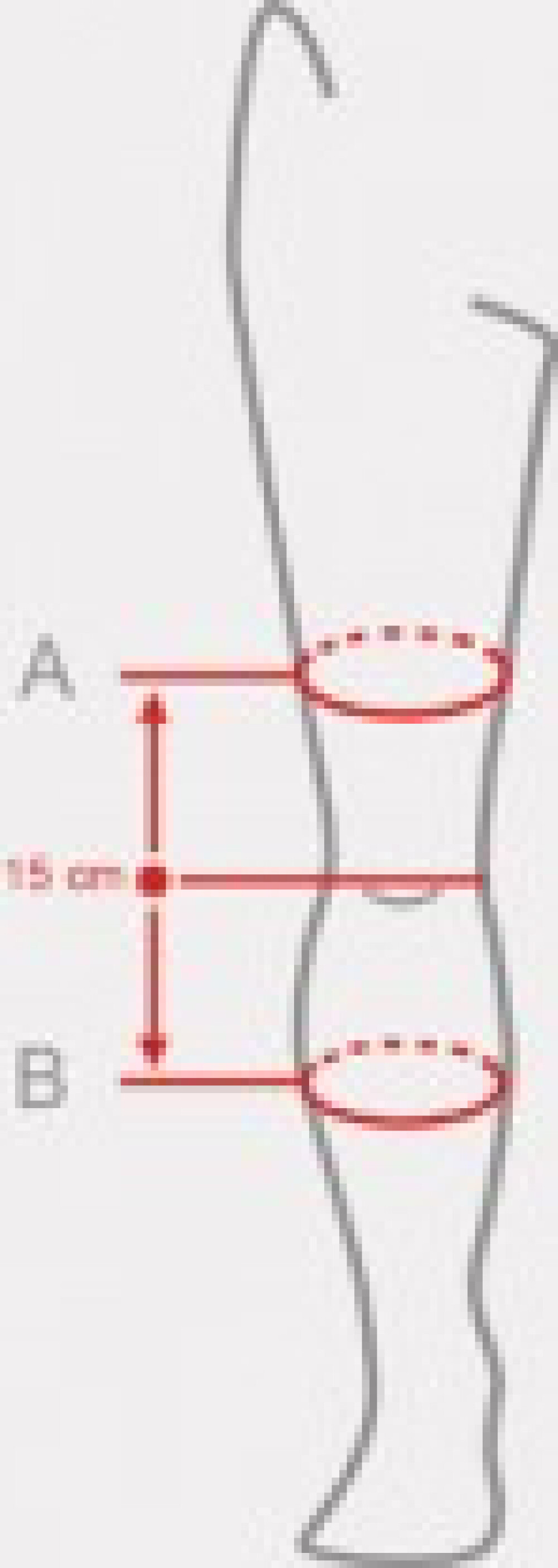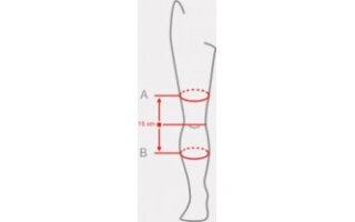 15 cm od sredine pogačice proti trupu izmerimo obseg stegna ter 15 cm od sredine pogačice proti stopalu izmerimo obseg mečne mišice.