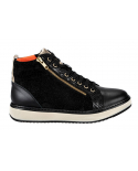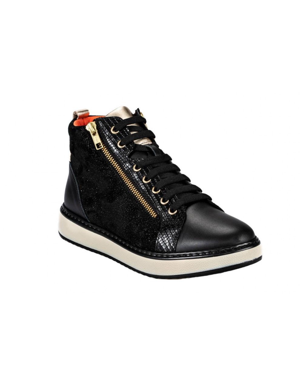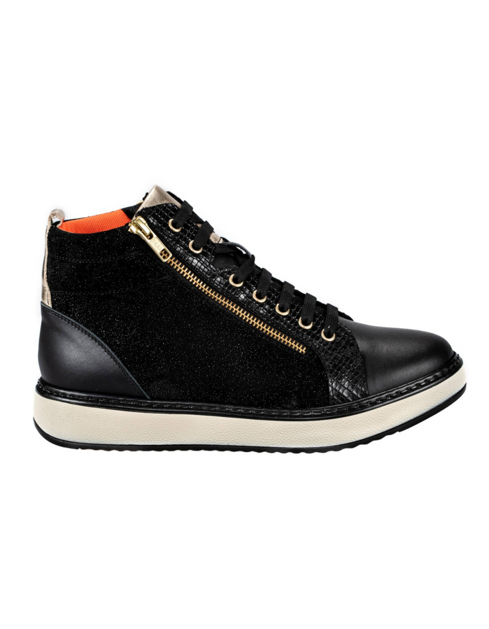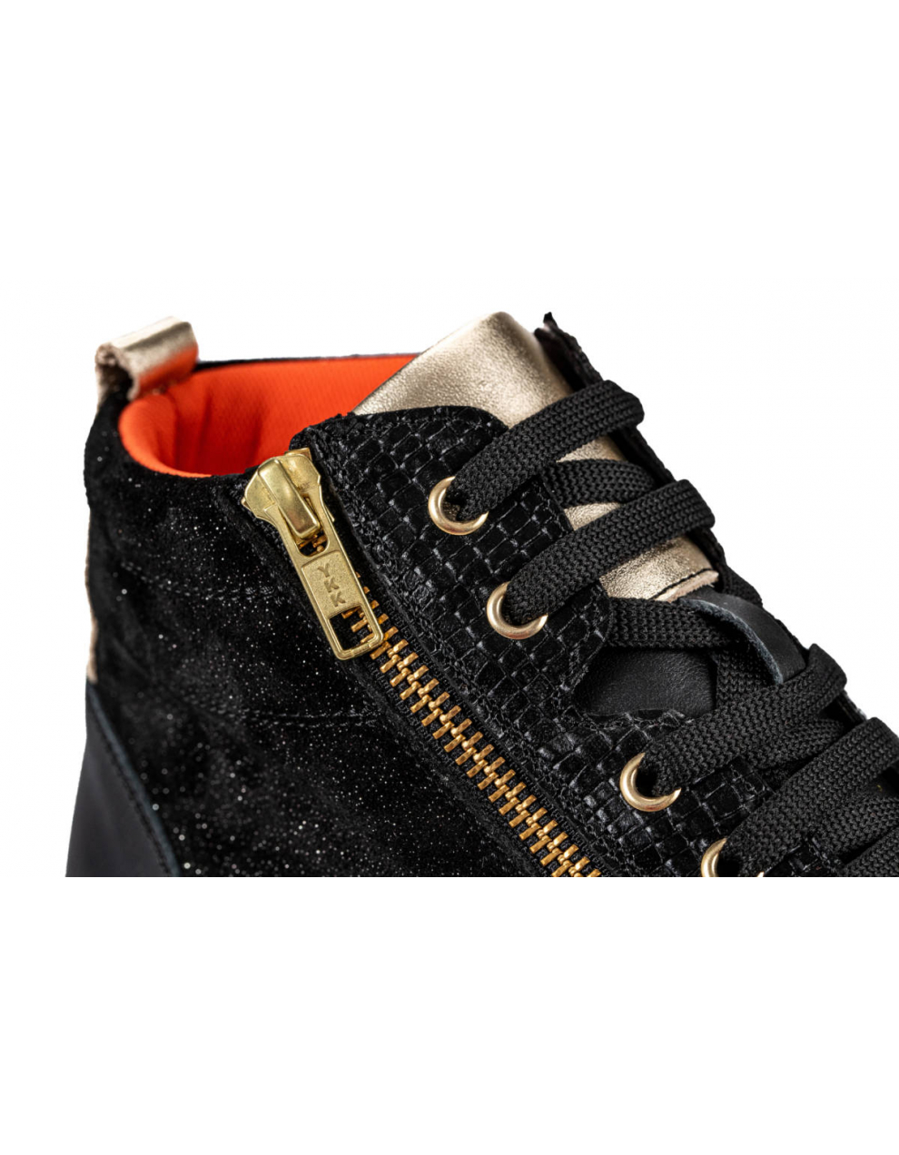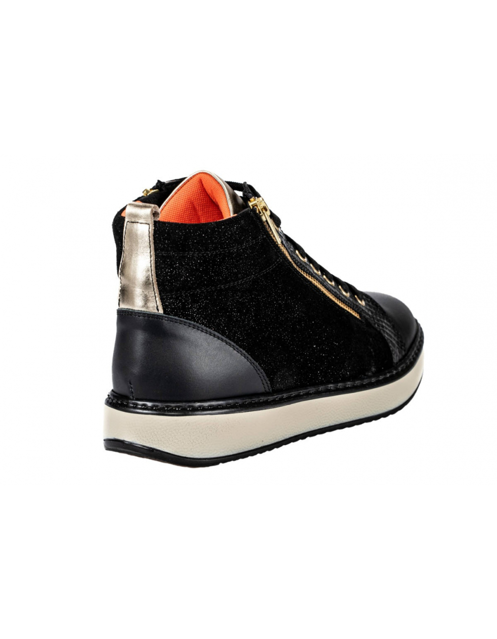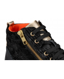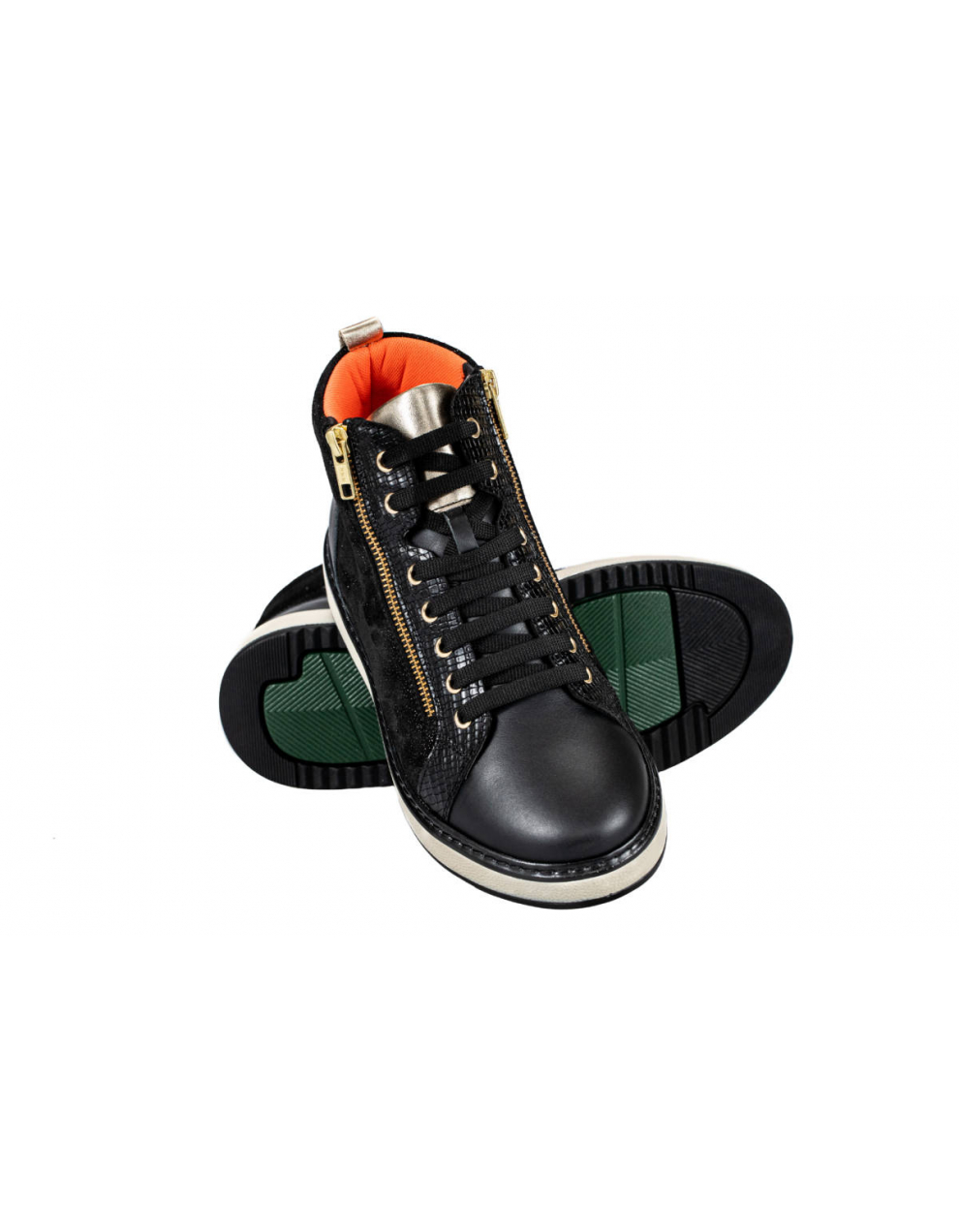 Elegantna visoka obutev Tropea črno/zlati, je primerna za težave s stopali, kot so hallux valgus, kladivasti prsti, revmatična stopala, diabetično stopalo in druge bolezni. Obutev nima notranjih šivov, zaradi česar je izjemno udobna in primerna za občutljiva, visoka in široka stopala. Zapira se z vezalkami, ter dvema zadrgama ob straneh.