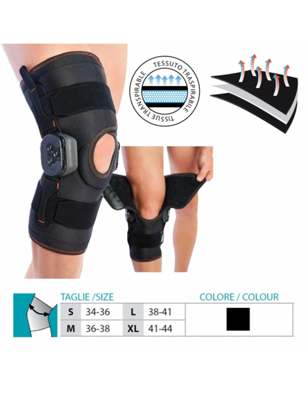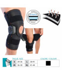 Ortoza za koleno z nastavljivim zglobom vsebuje: odpiranje na sprednji strani zgoraj ter na zadajšnji strani spodaj, odprtino za pogačico s stabilizatorjem, lamele s policentričnimi zglobi, ki se lahko nastavljajo v smeri fleksije, možnost nastavitve ekstenzije na 0-15-30-60-90 stopinj, trakove za zapiranje na zgornji in spodnji strani. Opornica je iz notranje strani oblečena v koži prijazen frotir - bombaž.