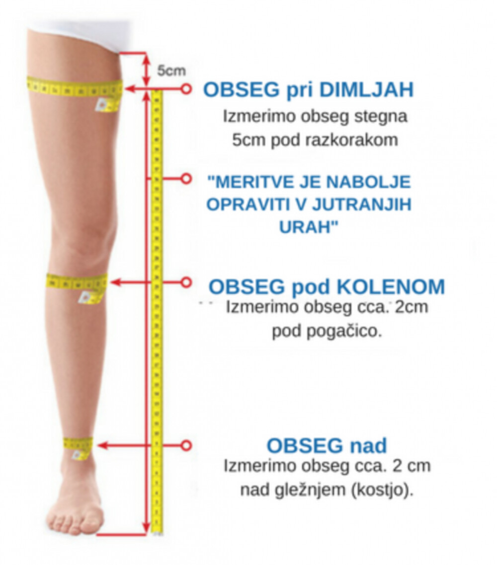 Na podlagi zdravniškega poročila o tipu nogavic (dokolenke, samostoječe, s pasom za eno nogo ali hlačne nogavice) ter o kompresijski stopnji (kompresija 1, kompresija 2 ali kompresija 3 ) se izvedejo potrebne meritve nog v stoječem položaju. Najbolj optimalne meritve se izvedejo v jutranjih urah, preden začnejo noge otekati. Na podlagi vaše višine, vaše teže (v kg) ter izmerjenih podatkov o različnih obsegih na določenih točkah (NAJPOMEMBNEJŠI: tik nad gležnjem, pod kolenom ter obseg stegna pri dimljah) Vam lahko ponudimo ustrezno velikost ter tip nogavic za vas.